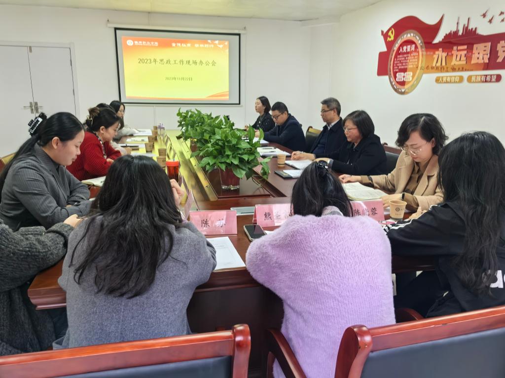 为进一步推进学校思政课建设,深入了解思政部工作开展情况,关心关爱思政课教师成长,11月22日下午,学校党委书记陈春来,副院长王方到思政部召开2023年思政工作现场办公会,党委宣传统战部主要负责人、思政部全体教师参加会议。会议由思政部党支部书记、副主任肖凌燕主持。