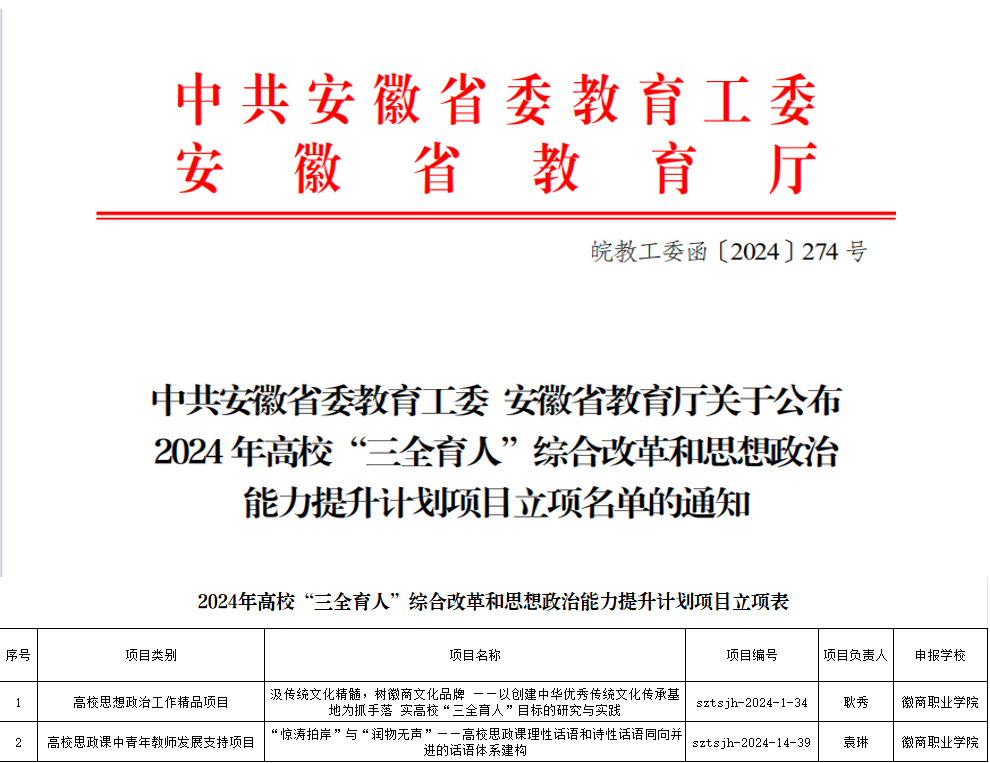 为深入贯彻落实习近平新时代中国特色社会主义思想和党的二十大精神,进一步推动实施时代新人铸魂工程,深化思想政治教育工作改革发展,学院积极组织教师申报省委教育工委、省教育厅2024年高校“三全育人”综合改革和思想政治能力提升计划,学院公共教育与服务系耿秀老师《汲传统文化精髓,树徽商文化品牌——以创建中华优秀文化传承基地为抓手落实高校“三全育人”目标的研究与实践》,马克思主义学院袁琳老师《“惊涛拍岸”与“润物无声”——高校思政课理性话语和诗性话语同向并进的话语体系建构》2个项目喜获立项。